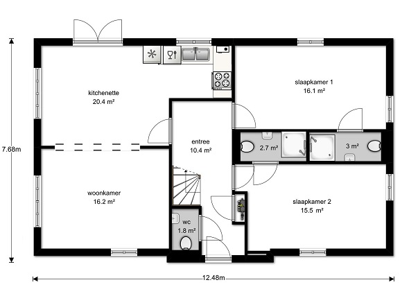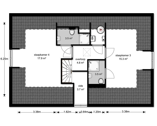 Indeling 1e verdieping : Via de trap komt u op de overloop van de eerste verdieping met 2 ruim bemeten slaapkamers. Beiden zijn wederom voorzien van eigen badkamer met douche, wastafel en toilet.
