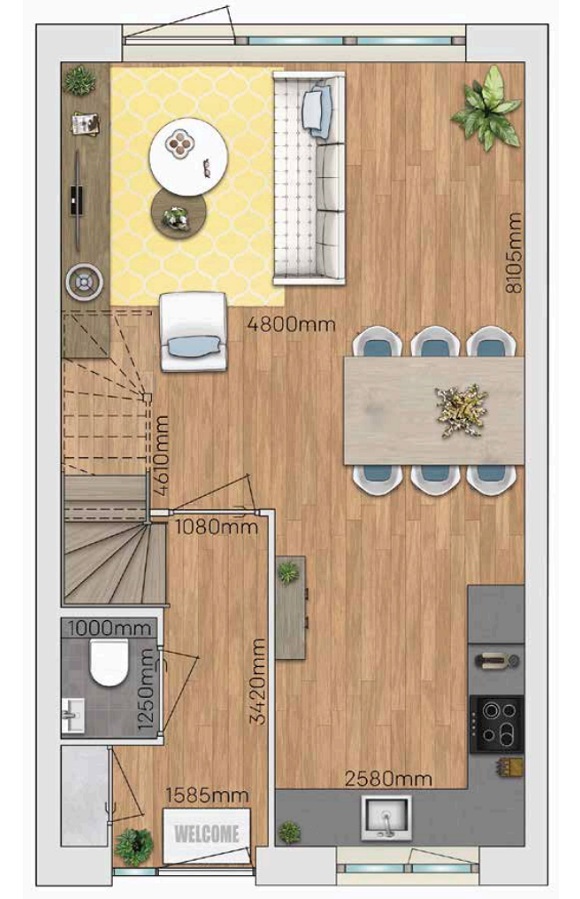 Indeling begane grond : Entree met meterkast, trapopgang, toilet en toegang tot de woonkamer. Ruime woonkamer met royale hoek-opgestelde keuken. De luxe keuken is uitgerust met een granieten werkblad, inductiekookplaat, afzuigkap, vaatwasser, koelkast en combimagnetron. De gehele begane grond is voorzien van een pvc vloer en raamdecoratie. Ook de verlichting is reeds aangebracht.